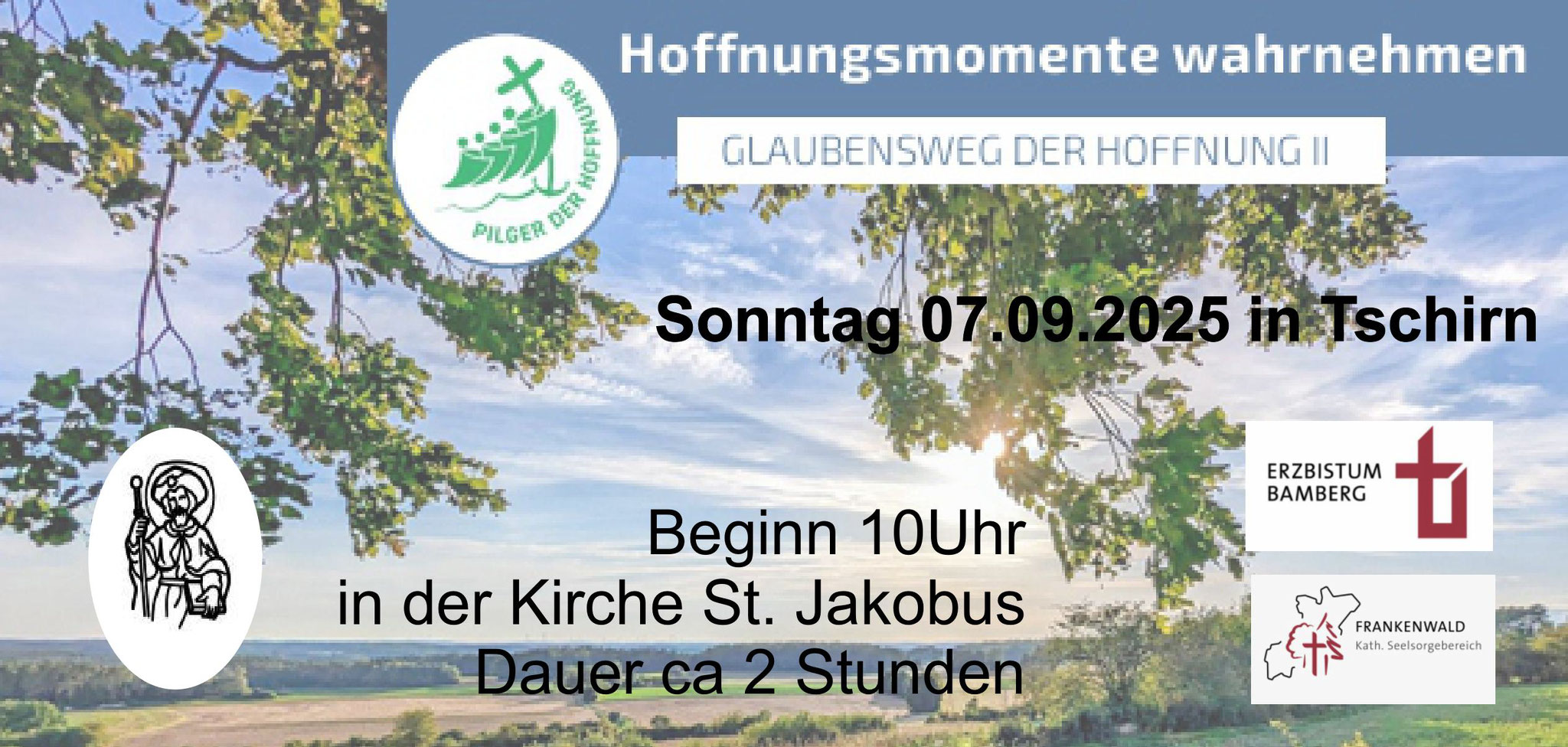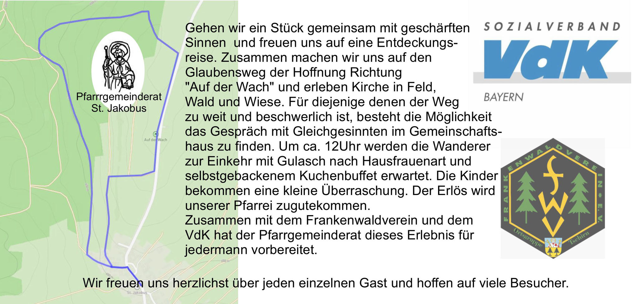 Gehen wir ein Stück gemeinsam mit geschärften Sinnen und freuen uns auf eine Entdeckungsreise. Zusammen machen wir uns auf den Glaubensweg der Hoffnung Richtung "Auf der Wach" und erleben Kirche in Feld, Wald und Wiese. Für diejenige denen der Weg zu weit und beschwerlich ist, besteht die Möglichkeit das Gespräch mit Gleichgesinnten im Gemeinschaftshaus zu finden.